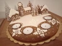 Letos jsem živý věnec nestihla. Byli jsme na dovolené a pp příjezdu u nás bylo 30cm sněhu. Letos jsem tedy improvizovala a udělala jsem honem perníkovou chaloupku a u ní zapalujeme svíčku 🙂