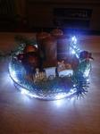 Mám věnec i svícen. Oboje jednoduché, svícen na dřevěném kolečku, červené svíčky, pár ozdob, světýlka a troška té zeleně 🙂