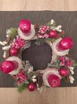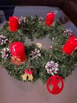 máme věnec, je z šišek a s červenými drobnými dekoracemi plus žluté svíčky.