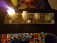 Máme svícen. Talířek s ozdobným lemem, svíčky a buraky. Jsem zvědavá, jak dlouho tam ty buraky vydrzi🙂