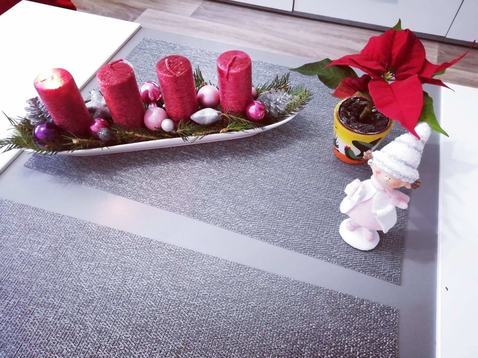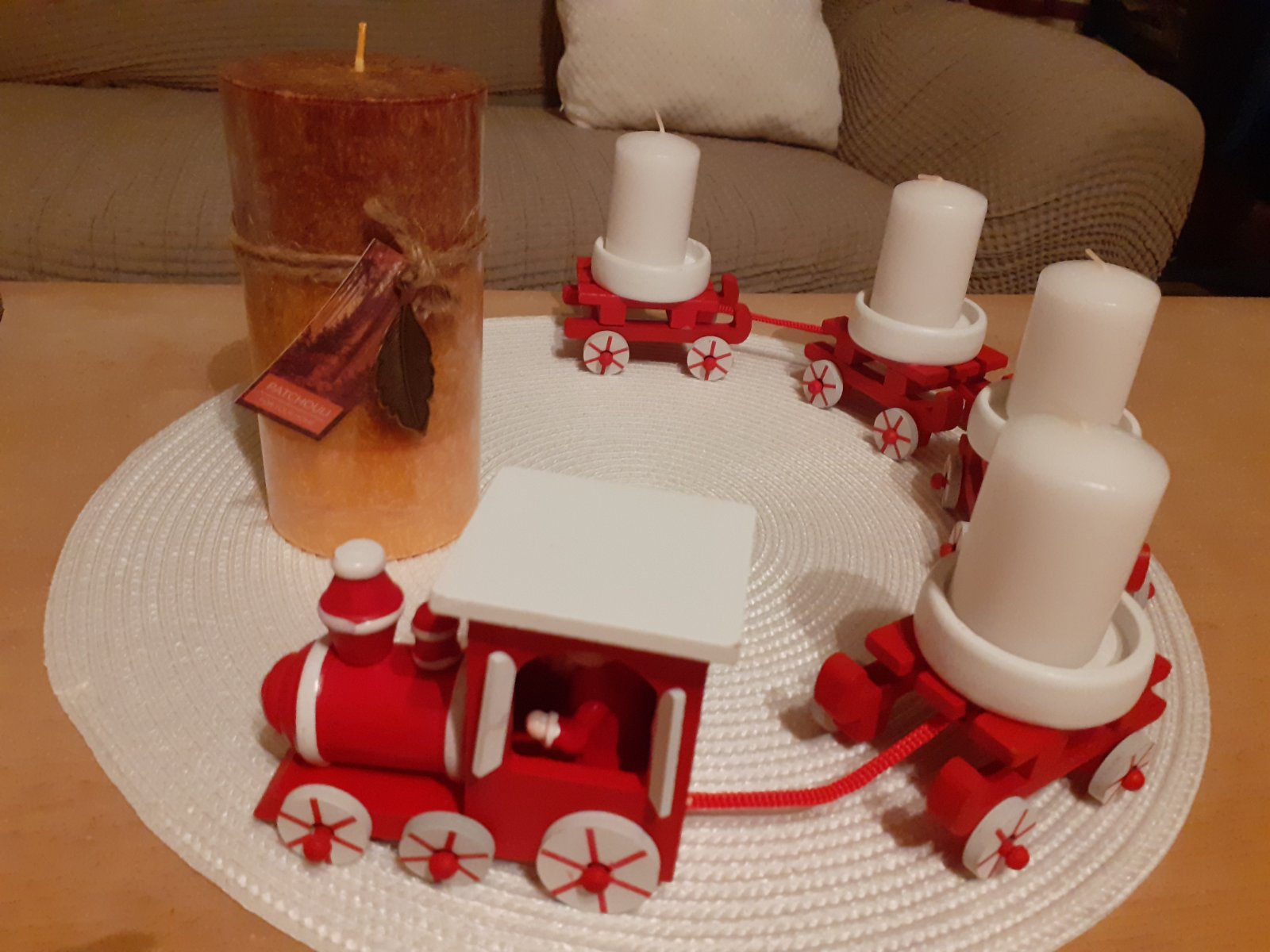 Těžko říct, jak ho nazvat, je velmi minimalistický. Na bílém čtvercovém kameninovém tácu jsou plastelínou přilepené čtyři skleněné kalíšky na čajové svíčky a do nich podle nálady vkládáme různě barevné a voňavé čajové svíčky. Nějak nebyl čas chystat něco většího, ale první svíčku jsme si v neděli zapálili, dokonce nám holky zazpívaly koledy, když jim zrušili zpívání u stromečku.