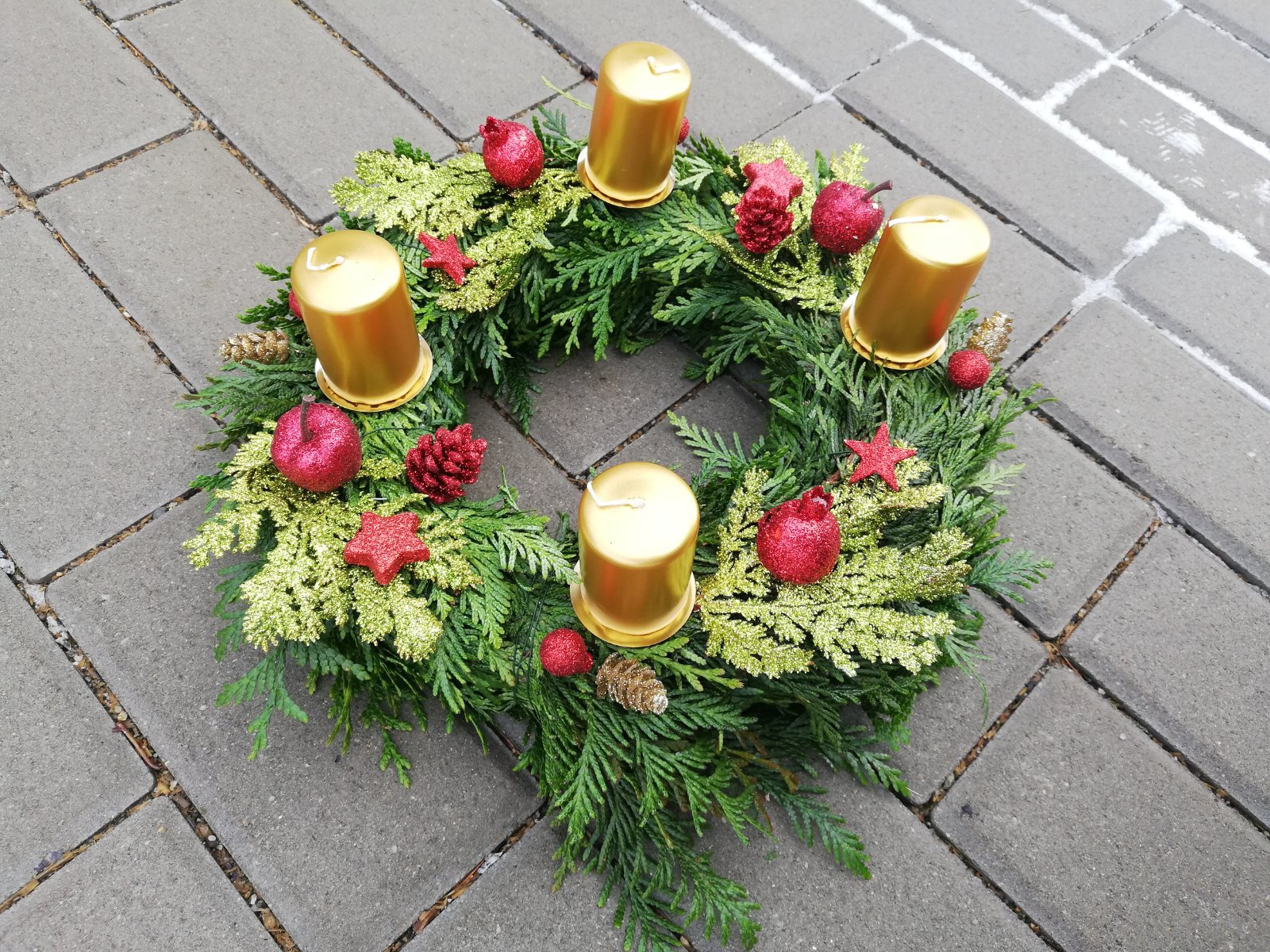 Máme kupovaný bílý dřevěný věnec ozdobený větvičkamis červenými zasněženými kuličkami a zlatými lístky, kam každý rok dokoupím jen svíčky. Letos jsem přikoupila zelené větvičky, abych ho trochu obměnila.