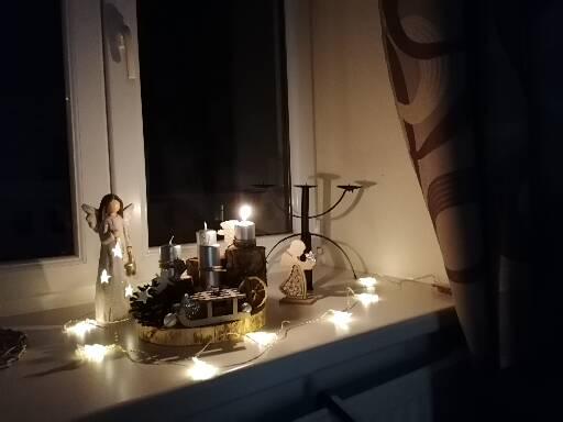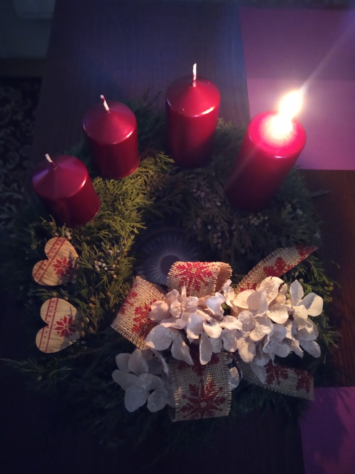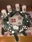 Máme věnec i svícen. Oba jsou hodně přírodní. Věnec je z větviček, šišek, ořechů a svícny máme dva první - podstavec dřevěný kruh, bílé svíčky, větvičky, šišky ořechy. Druhý ( je to již pár let) dělala dcera ve školce z keramiky to je moje srdcová záležitost. Momentálně ležím v posteli tak jen popis.
