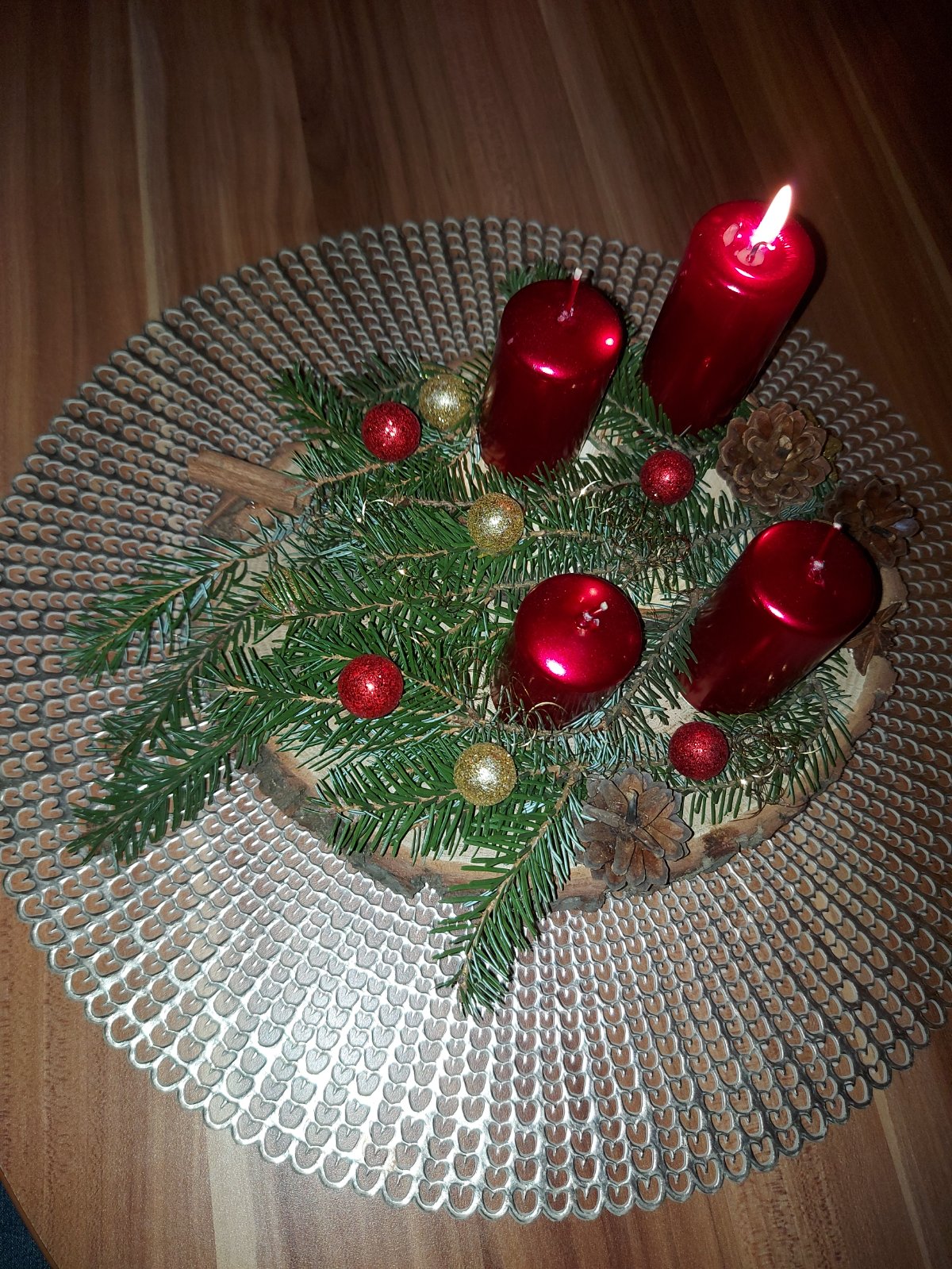 Svícen máme se 4 svíčkami na dřevěném kruhu a s přírodní klasikou 🙂 dominuje barva zelená a červená. 🙂