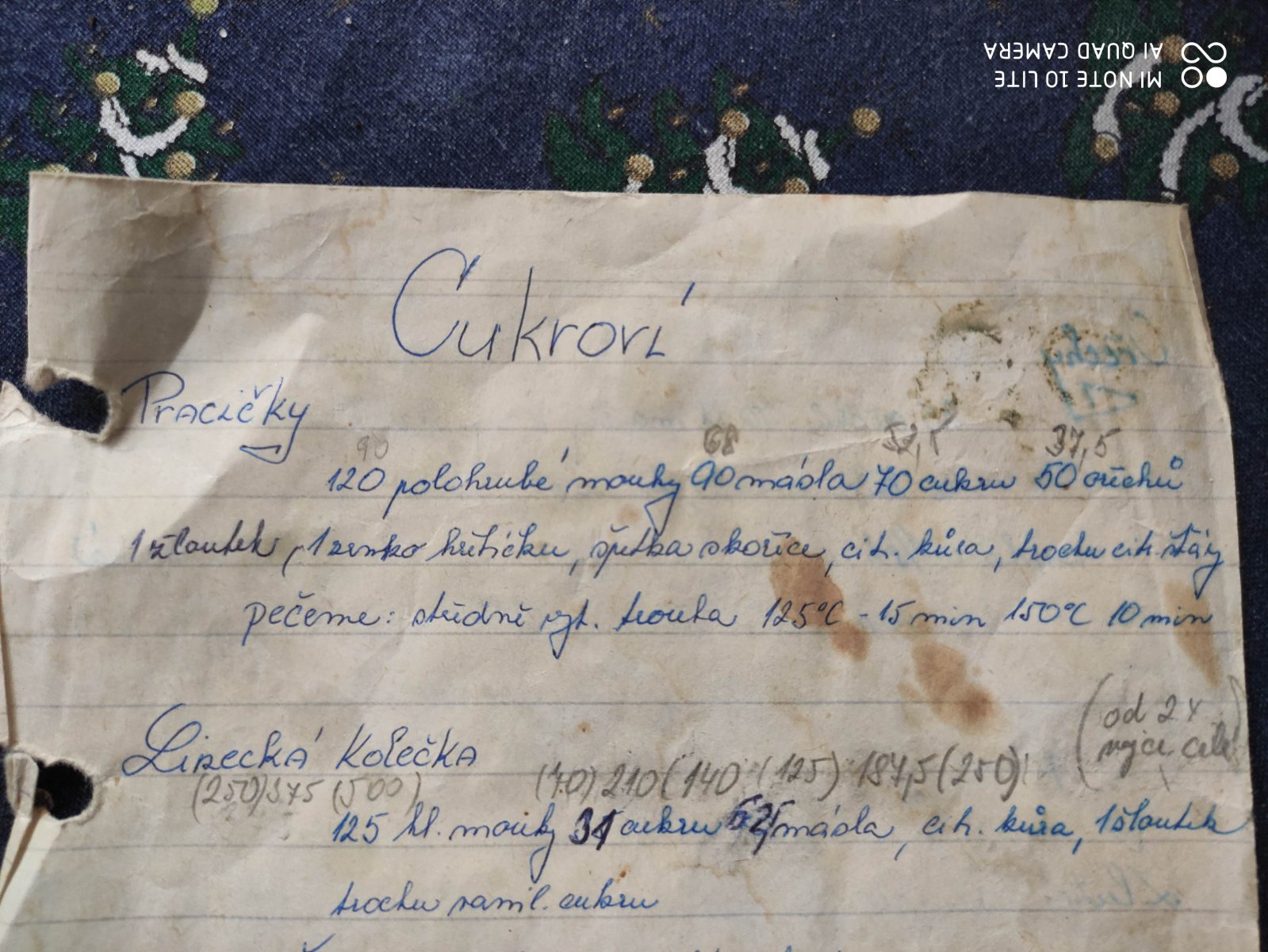 @sooonix ahoj posílám vyfocený recept pro jistotu ještě radši přepisuji nevím zda to po nás půjde přečíst 120 g polohrubé mouky 90 g pravého másla 70 g cukru 50 g vlašských ořechů mletých namleté jedno zrnko hřebíčku špetka skořice citronová kůra trocha citronové šťávy může se přidat jeden žloutek.