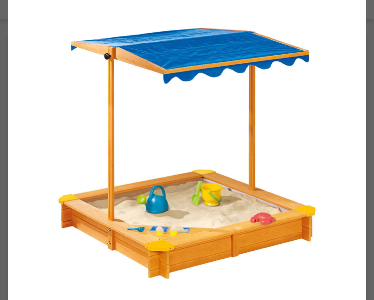 Ta stříška je tam těžce na nic. Po pár vytahování hore to popraskalo, před sluncem to v podstatě nijak nechrání a ani to není nepropustné proti vodě, přikrýváme to ještě starým linem, jinak tam chčije. Pískoviště samo o sobě špatné není, lepší než ty plastové hovadiny, ale stříška moc účel neplní.