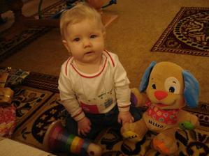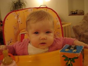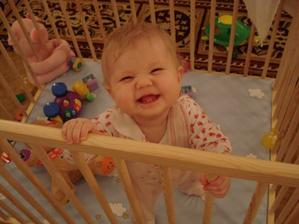 tak už mi je 9 měsíců, utíká to rychle, umím spoustu věcí a už vůbec nejsem malé miminko, chci si pořád hrát, dělat blbosti a mamince dávám znát, že mě má, hlavě v noci. Mám už 2 zoubky, hezky sama sedím, u toho si i zatleskám a maminka říká, že jsem její miláček