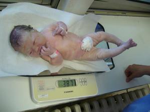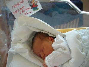 Naše dceruška se narodila 28.července 2009 v 15.25 s mírami 53cm a 3860g. Porod byl vyvolávaný z důvodů většího miminka a trval 9,5 hodin od zavedení první tablety.***Ve 3 týdnech váha 3940g, 54,5cm.