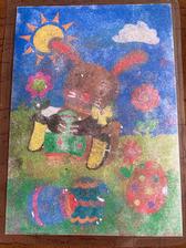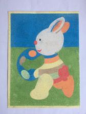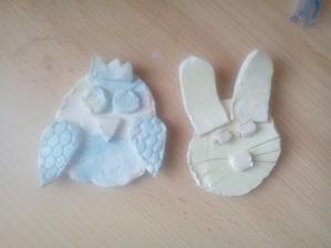 Zajicek - uz jsme nestihli dotvorit, deti uz nevydrzely, zase rulicka od toaletaku, starsi nakreslil kralickovi oblicej a pacicky, jeste mel byt cumak z perlicky a perlicky na kytickach
