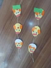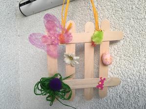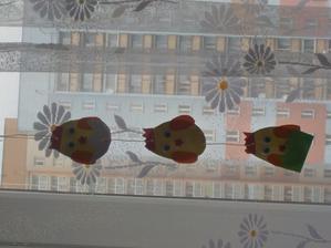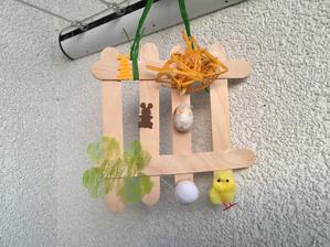 Závěs kuřátka - děti namalovali kuřátka na žluto a pak jsme lepili, Tygřice lepit nechtěla (prý máma lepit) nakonec se nechala přesvědčit a nalepila alespoň trávu a skořápku, zatímco Hrošík lepil všechno sám