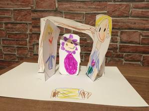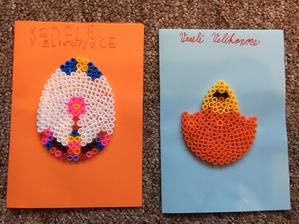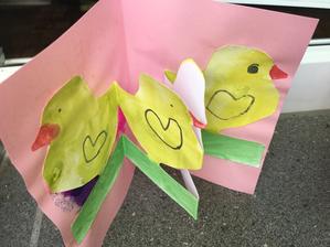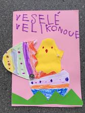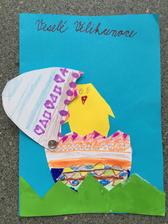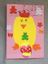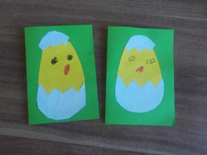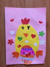 Přáníčko kuřátko - nakreslila jsem obrysy a starší sám i stříhal z barevného papíru, pak nalepili a dokreslili oči a zobáček