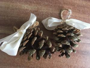 Šišky (tvořeno ve školce) - konce šišky natřeny herkulesem a pak dány do třpytek a nakonec tavnou pistolí přilepená mašlička a provázek na pověšení