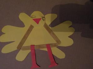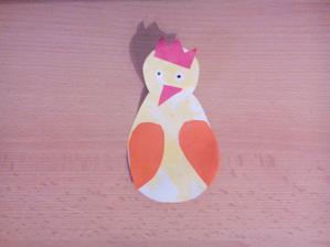 Kuřátko - děti si obkreslili ručičky na žlutý papír, Hrošík sám i vystřihnul, nabarvili jsme špejle od nanuku a slepili jsme nejdřív ručičky, tak jsme na ně nalepili špejle, vystřihli jsme hlavu a děti nakreslily oči a nalepily zobák a pak hlavu přilepily k tělu, nakonec jsme vystřihli a nalepili nohy
