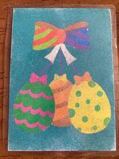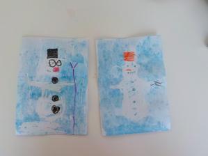 Vánoční přání se sněhuláčkem - vyrobila jsem šablonu z tvrdého papíry a děti jej vymalovaly voskovami a nakreslily mu oči a knoflíky, pak jsme přetřely celé přání vodovkami a nechali jsme zaschnout