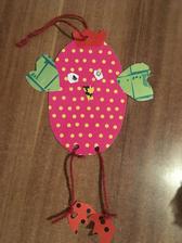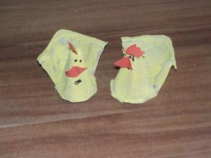 Kuřátka - z tvrdého papiru jsem vystřihla obrys, děti je namalovaly na žluto, křídla, oči, zobák a hřebínek jsou ze samolepícího papíru, zobáky stříhal syn, ja zbytek, děti lepily, dcerce jsem pomáhala, sy lepil sám, oči jsem lepila já