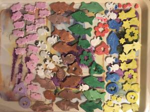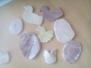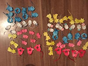 Ozdoby ze samotvrdnoucí hmoty - chtěla jsem udělat pro nás ale děti rozhodly, že potřebují i pro každého kamaráda ve školce, po vyschnutí děti namalovaly a já přidělala bavlnu aby šlo pověsit.