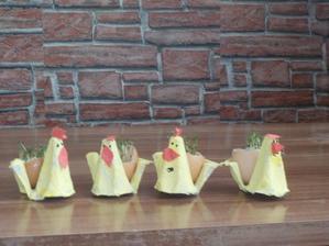 Kuřátka z obalu na vajíčka - děti nabarvily vystřižený tvar barvami a pak lepili zobáky a hřebínky a nakonec jsme malovali oči, malé jsem pomohla a starší se nejdřív snažil sám (což je vidět, protože jsou oči i pod zobákem 😀)