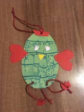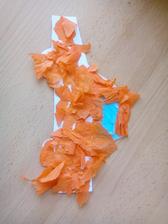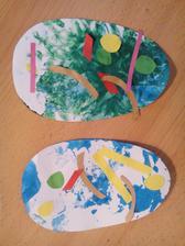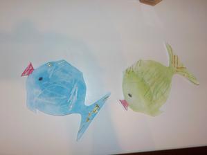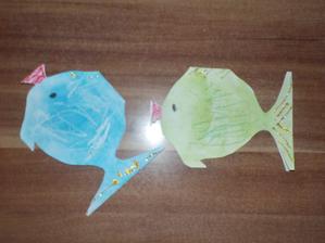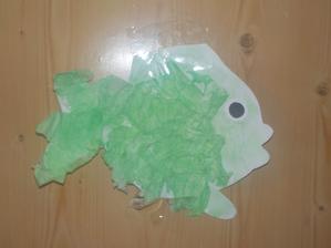 - kapříci - nejdřív děti na vystřihnutého kapříka nalepili zředěným herkulesem natrhané papírové kapesníky, aby byly šupinky plastičtější, po zaschnutí na barvili na zeleno a nakonec dolepili připravené oko