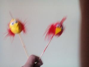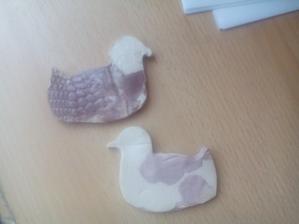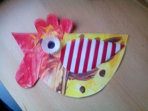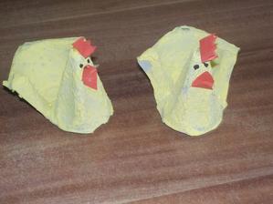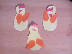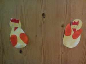 Velke slepicky - deti namalovaly barvami, po uschnuti starsi nalepil kridylka a oci na obe slepicky