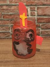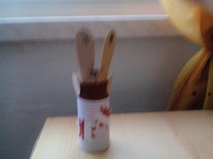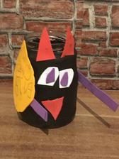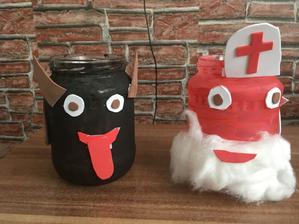 Lucerničky čert a Mikuláš - zavařovací sklenice od okurek, děti namalovaly barvou podle toho co za lucerničku chtěly, nechali jsme zaschnout barvu, pak jsem jim na montesgumu nakreslila obrysy očí, pusy, rohů, čepice a chtěly ještě pytel - pro čerta na zlobivé děti a pro Mikuláše na dárky pro hodné děti, přilepeno oboustrannou lepící páskou a Mikulášovy vousy jsou z vaty a taky přilepené na oboustranné lepící pásce
