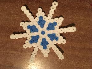 Ozdoby ze zažehlovacích korálků - syn (5) chtěl sněhuláka tak jsme našli šablonu na internetu a on to podle ní celé poskládal, dcerka (4) dělala vločku, podle mých instrukcí, asi v polovině jí to už přestalo bavit tak jsem jí s tím pomohla. Vyrábíme další a další 🙂