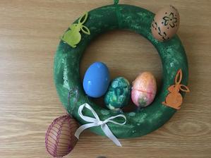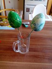 Kraslice - zkoušeli jsme mramorování lakem na nehty, ale moc se nepovedlo a nakonec polepeno samolepkami