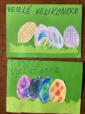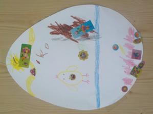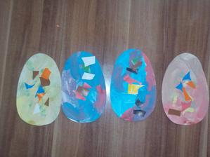 Papirove vajicka - uz tvoreno doma - vystrihla jsem vajicka z papiru deti namalovaly a kdyz zaschly nalepily ozdoby predem vystrizene