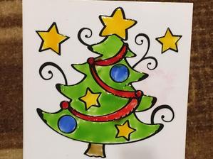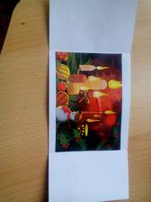 Vánoční přání rybičky - papír je přeložený na půl v místě horní ploutne je spojený (šlo by to i u ocasu) děti voskovkami namalovaly pusu, oko a šupinky, pak to přetřely vodovkami a po uschnutí jsme nanesli třypkové lepidlo