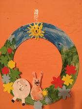 Velikonoční věnec - korpus z tvrdého papíru děti namalovaly barvami a stejně tak i zajíčka. Obrys zajíčka a hlavičky ovečky a její nohy jsem předpřipravila. Všechno kreslily samy. Ovečka - hlavička a nohy nalepeny na odličovací tampon. Kytičky jsem udělala pomocí razidlo a děti vybíraly jakou barvu chtějí. následně děti všechno nalepily na věnec a ten jsme pověsili na zeď.