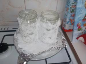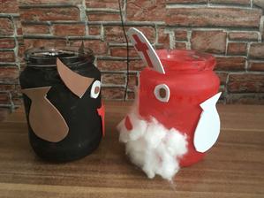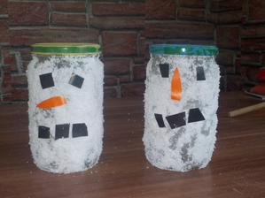 - sněhuláčci (lucernička) - zavařovací sklenice potřená herkulesem smíchaným s vodou (příště bude čistý, blbě to drželo), vyváleno v umělém sněhu (lze použít i něco jiného), víčka natřené prstovými barva a barevné papíry jsou přilepené tavnou pistolí (lepidlem nechtěly na tom umělém sněhu držet)