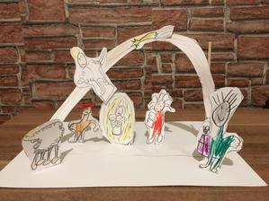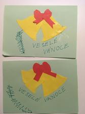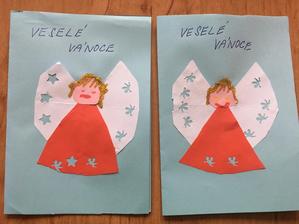 Vánoční přáníčka - letos u nás ve stylu stříhání a lepení barevných papírů - nakreslila jsem obrysy, děti vystřihly a nalepily a pak dokreslily fixy, vlasy andílka jsou lepidlo se třpytkami (loni jsme měli na šupiny kapra)