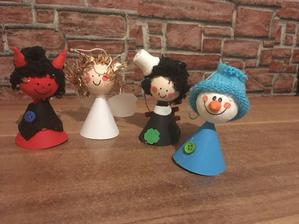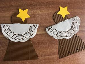 Andělíčci (tvořeno ve školce) - na tvrdý papír jsem nakreslila obrys, děti vystřihly, papírový tácek přeložený napůl a uprostřed prostřižen a navlečen přes hlavičku, pak přilepeno a přilepená i papírová hvězdička na čelo, syn ještě udělal razidlem hvězdičky