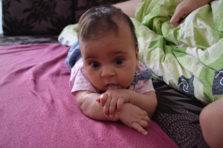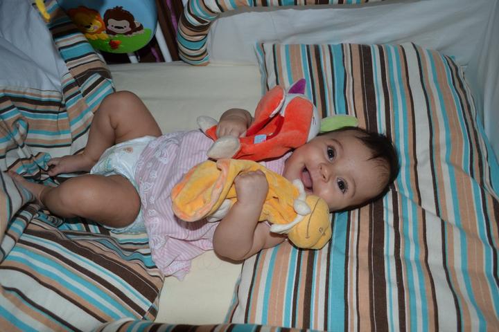 Dneska je naší lásce přesně půl roku. Umí se otáčet ze zad na bříško a z bříška na záda. Bez problémů pase koníčky, zapírá se o dlaně, hlasitě se směje, což je velká legrace. Žvatlá si pár slabik a brumlá si, zajímá se o hračky a dokáže poznat kdy jsem přísná a kdy je to legrace. Jsem ta nejpyšnější maminka.