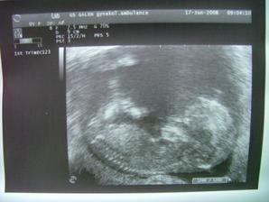 17.6. druhá poradna, hematom už není. Mimi mělo podle UTZ 13+1, podle PM 12+4. Zatím všechno v pořádku, podle vyšetření pana dr. je prý zatím mimi bez zjevných vad neslučitelných se životem, hodně živé, zamávalo mi, cucalo si palec, podrbalo se na hlavičce, dělalo kotouly, kopalo si nožičkama. Krásný zážitek, můj první.