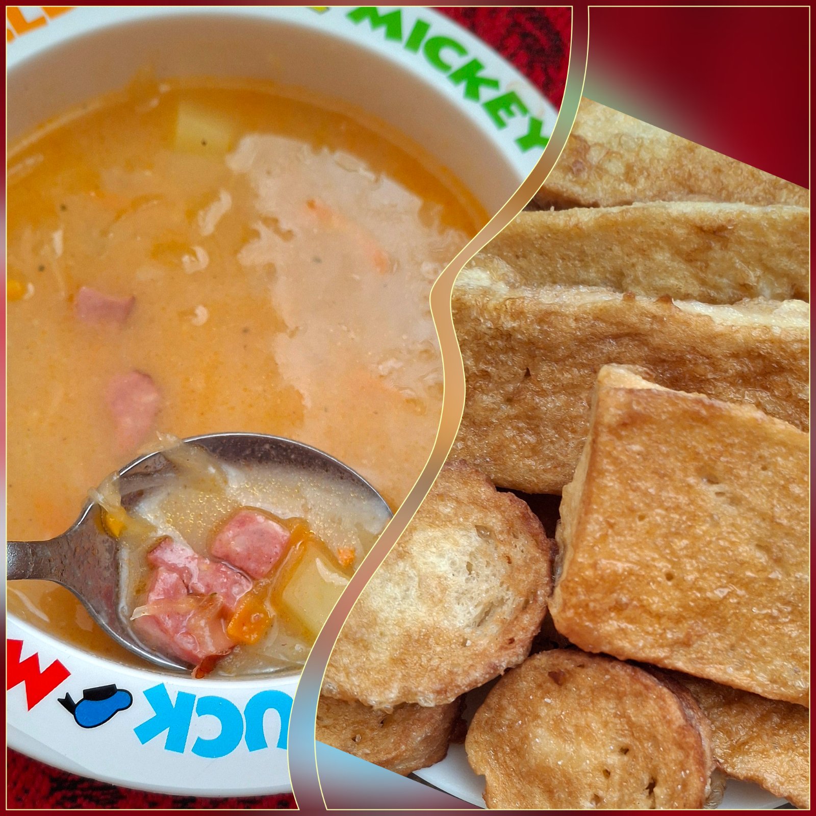 Kapustova polievka s klobasou a zemiakmi,rozky vo vajicku