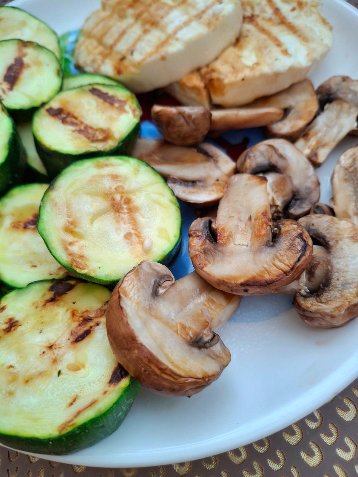 Moj obed,na minigrile doma grilovane sampinony,cuketa,kozi syr
