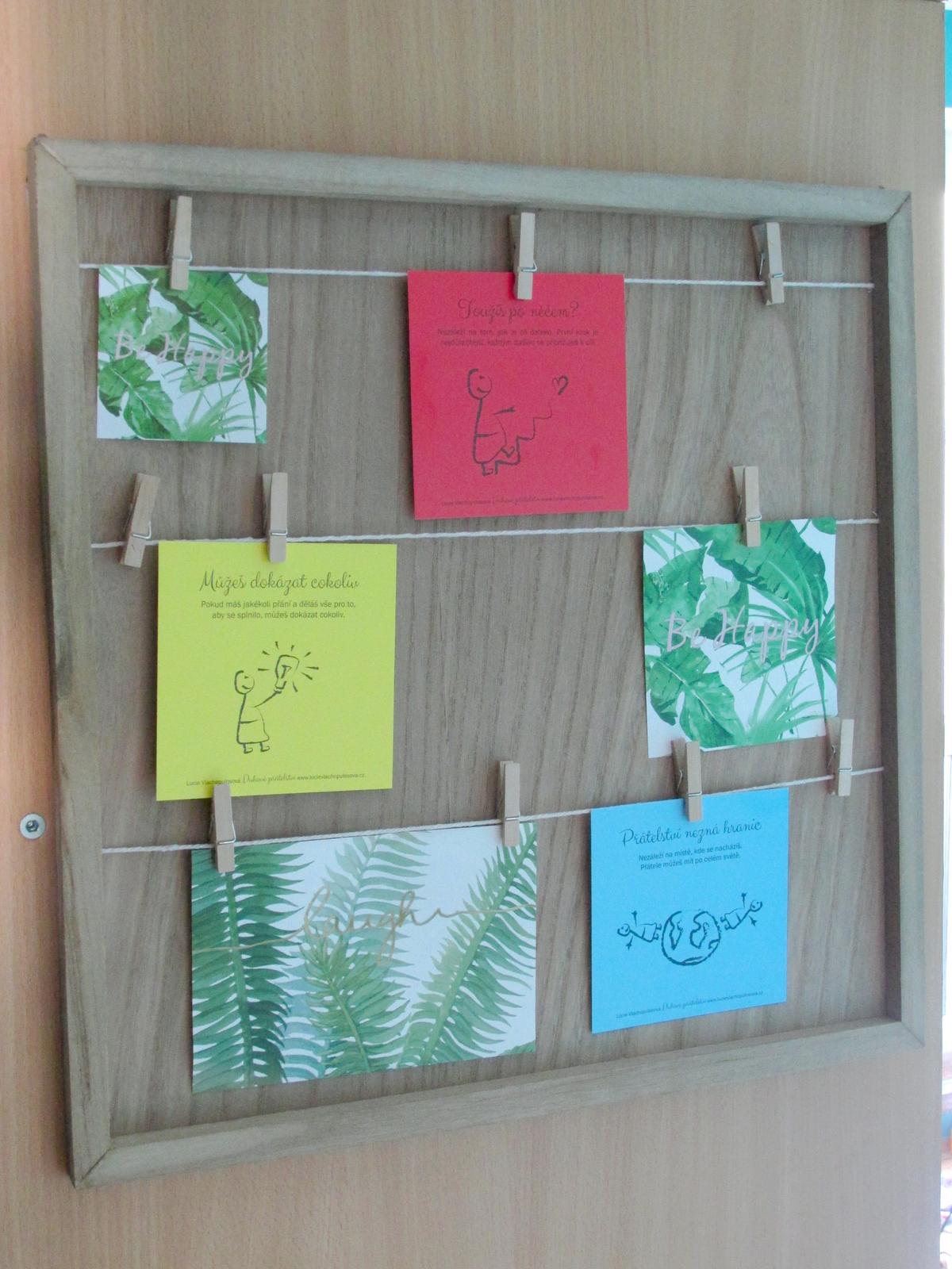 Parádní nástěnka, která může být využita na fotky, vzkazy, pohledy či důležité dokumenty, které chcete nebo potřebujete mít stále na očích. Já ji využila na barevné motivační kartičky.
