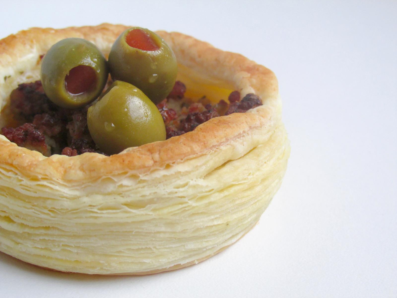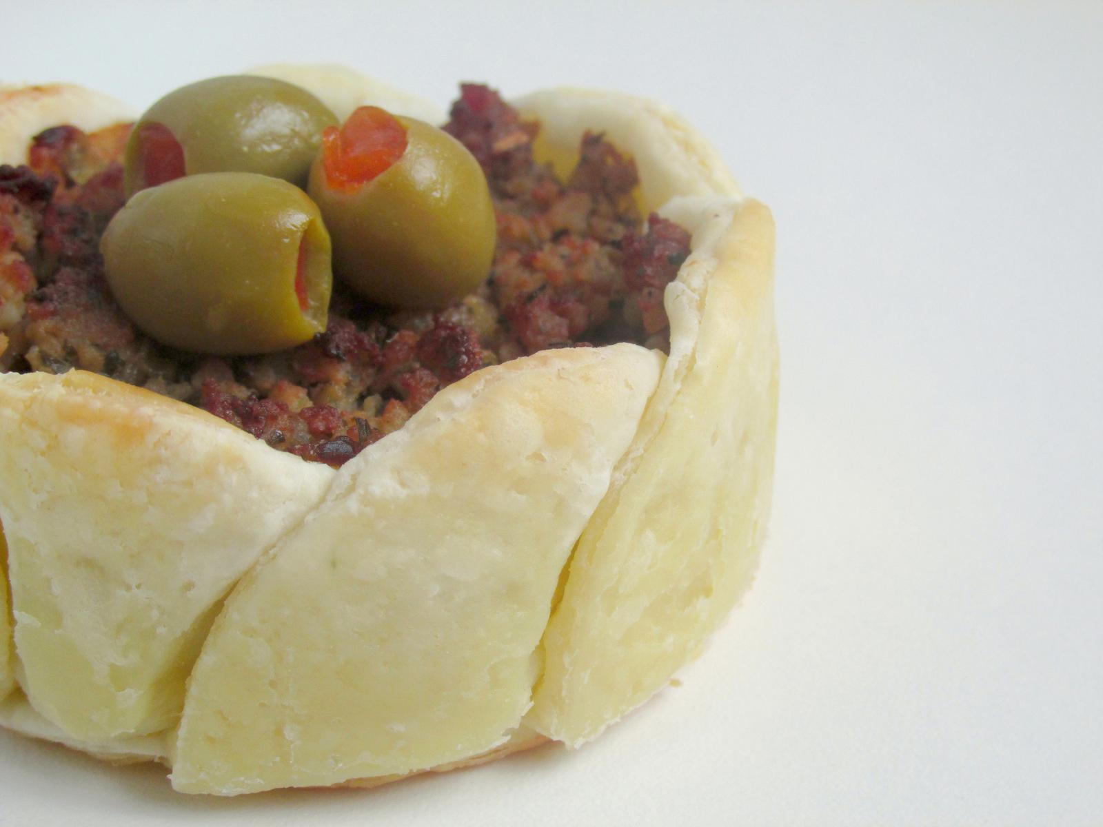 Košíčky z listového těsta plněné směsí z mletého masa.