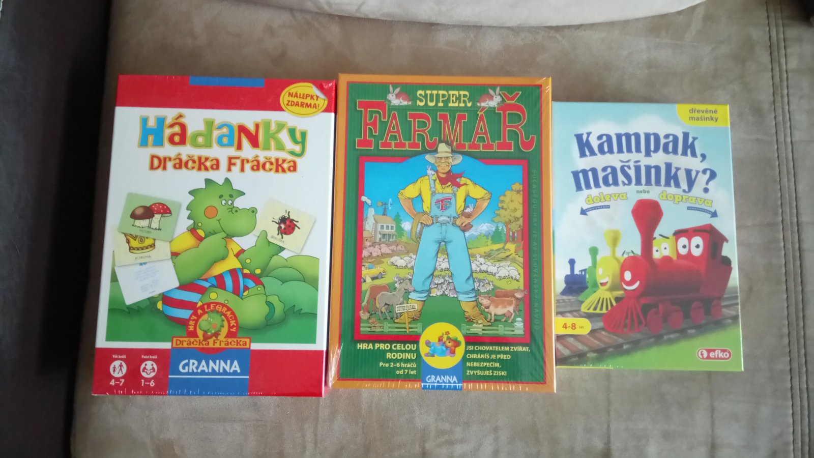 Loni dostal kolo (pokud tedy teprve 3 mít bude ten tvůj) a spoustu hudebních nástrojů. Letos to vidím na batůžek do školky, další hudební nástroje, nějaké výtvarné potřeby a zrovna dneska dorazily tyhle hry. Ale syn je docela specifický, klasická auta, stavebnice atp. mu nic neříkají.