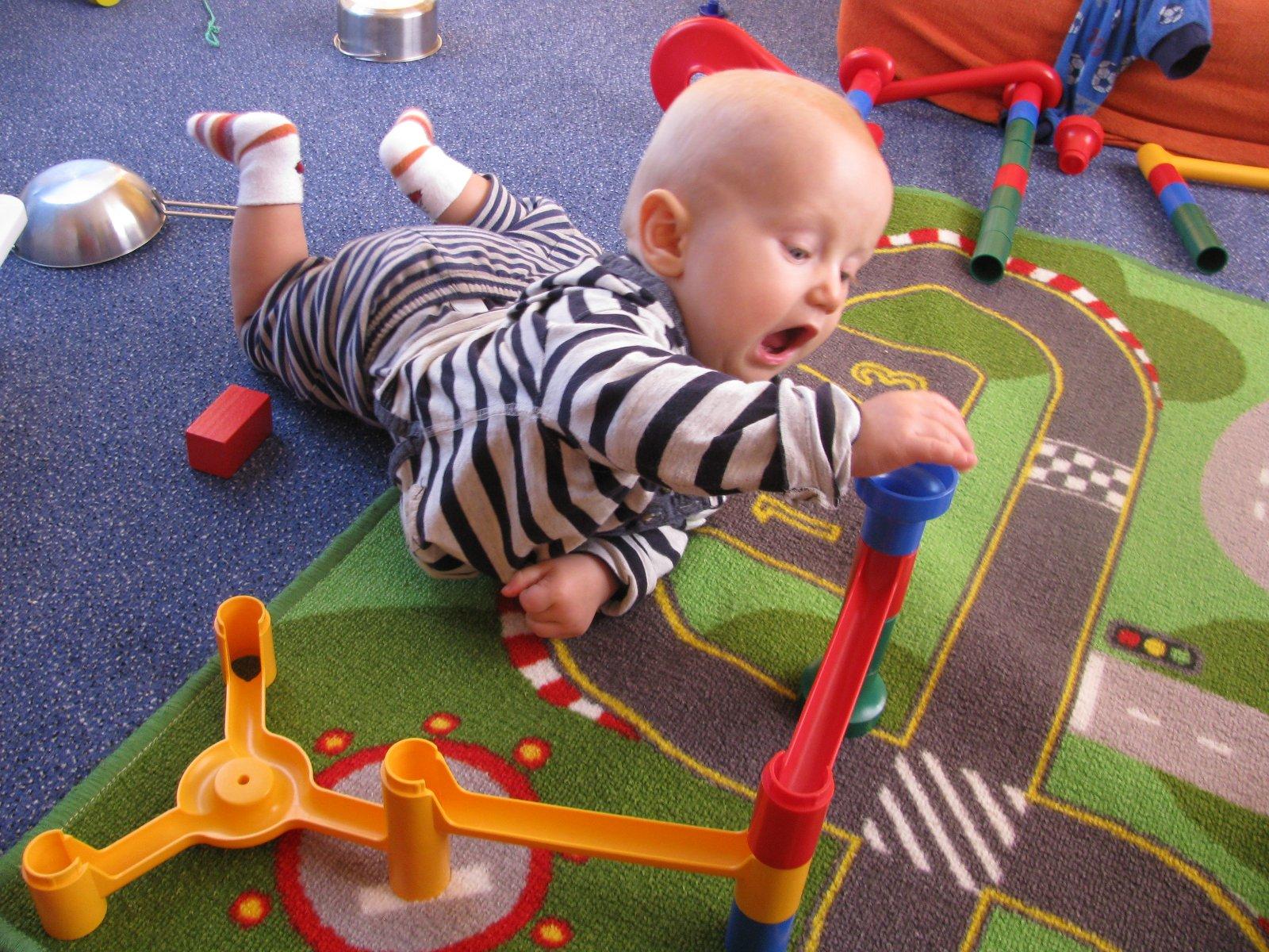 Hrál si s ní Honzík (u něj je už více jak rok velmi oblíbená, tj. doporučuji těm, co mají starší děti a dosud ji nevlastní) a Tonda chtěl samozřejmě asistovat. Tak jsem mu postavila menší verzi a opravdu dlouho se tím zabavil. Ano, opět je tu konflikt - háže se do toho malá skleněná kulička. Ano, strkal mi ji do pusy. Hlídala jsem ho, nechala chvilku požužlat a pak jsem ho správně nasměrovala a dala pokyn : "vyplivni" a on ji vyplivl rovnou do dráhy a kulička valila jak namazaná 🙂 Pak už si žužlací potřebu naplnil a vhazoval kuličku přímo prstíkama. Takže za nás fajná hra