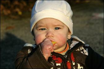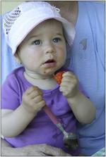 Emme je skoro pul roku, uz mesic se plazi, davno se pretaci na obe strany, snedla by vsechno, takze uz se klepe na prikrmy. Zatim dostava kasi a moc ji chutna.