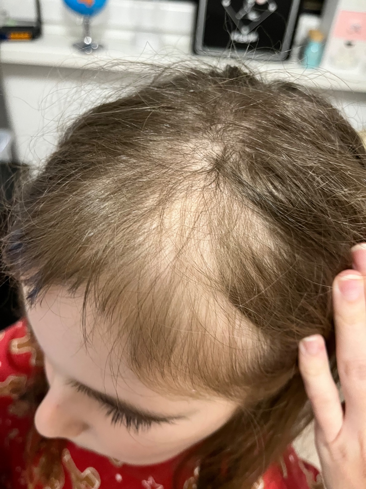 Teď asi 3 týdny zpátky se nám zdálo jakoby si ostříhala ofinu, dušovala se že opravdu ne a teď se mi zdá že se ji udělalo kolem pěšinky prořídlé místo ale má tam normálně jemné vlásky nemá to červené ani jí to nesvědí