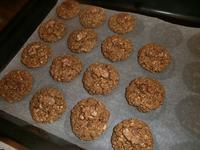 Sušenky z ovesných vloček: 1 1/2 hrnku ovesných vloček1/2 lžičky soli1/2 lžičky jedlé sody2 ks jablek4 lžíce medu1 hrnek polohrubé mouky1 ks kypřícího prášku1 ks vanilinového cukru1 ks vejce1 lžíce vodyPodle chuti: lžička skořice hrst rozinek (brusinek, oříšků, čokolády, semínek) drobné ovoce na dozdobení