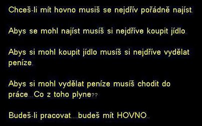 Asi bych měla něco sníst.......... Přichází domů manžel s oblíbenou žertovnou otázkou na rtech: "Cos tady celý den dělala?" Bez jakýchkoli skrupulí pronáším neomaleně: "Blila." Manžel se hurónsky směje, považujíc to za dobrý vtip, otvírá dokořán ledničku a volá na mě: "Co máme k jídlu, maminko???"