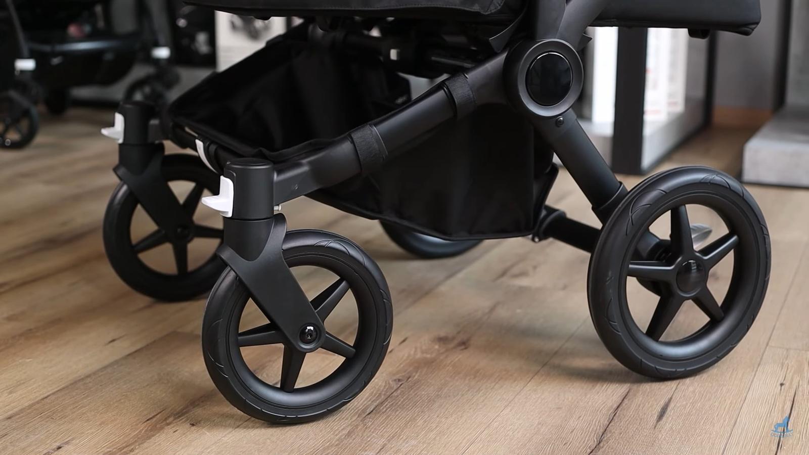U předních kol odpružení zkontrolujete tak, že zatlačíte na přední nápravu, a u zadních kol zase stlačením konstrukce na bocích. Mělo by být citelné a kočárek by se měl „zhoupnout“, tak poznáte, že dostatečně pruží.