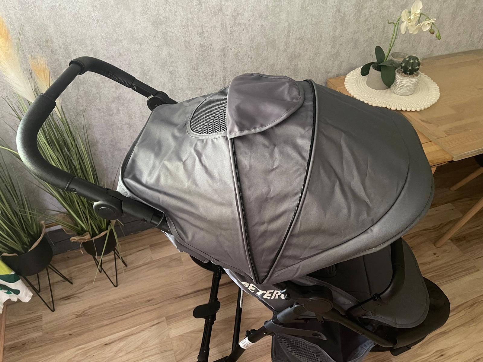 Jednoduchá prodlužovací stříška s nehlučným rodičovským náhledovým okénkem má XL rozměr. Mně osobně ve stříšce chybělo zabudování ventilačního okénka, které bývá většinou schované pod zipem, protože v teplých letních dnech napomáhá kvalitnější cirkulaci vzduchu.