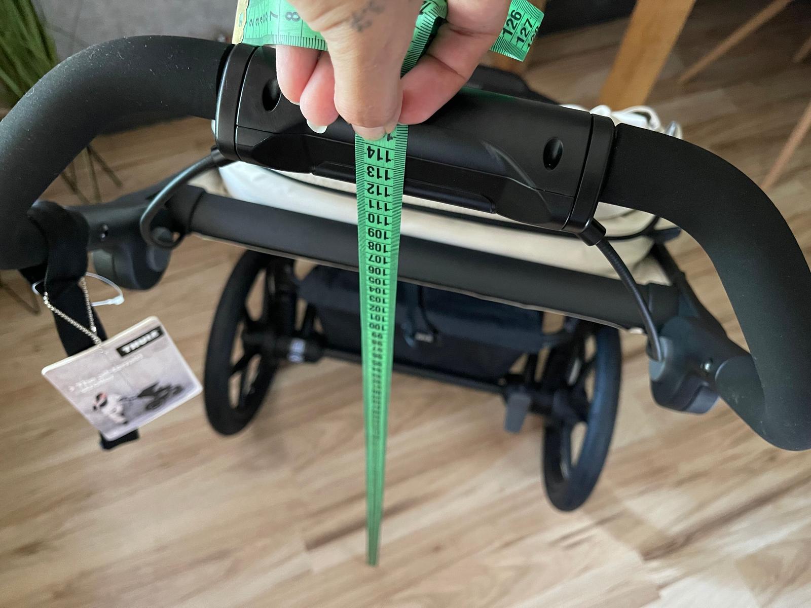 Rodičovská rukojeť má ergonomický tvar a protiskluzovou úpravu, lze ji nastavit ve výšce od 93 do 112 cm, díky čemuž vyhovuje různě vysokým rodičům.