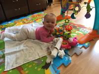 Dobre ráno,tak naše Adrianka ma 5,měsíců. Měli jsme problém s leženim na bříšku páč naše beruška spěchala zvedala se i na loktech, ale ručičky moc blizko a přepadávala a vubec ji to nebavilo.zacala jsme chodit na rehabilitaci a hodne se zlepšilo, doporučení bylo ji na bříšku motivovat.jenze všechno ji brzo omrzelo.asi před třemi týdny se nam sama zacala otáčet na bok a za par dni už rovnoi na bříško a od te doby ji jinak nenajdu nez na bříšku.a stal se z ni pěkný divoch,ráno dokáže 2 hodiny povidat a hrát si s chrastitky.hraje si na dece co mame na zemi jenze ji vadi ze se deka shrnuje a klouže. Hracky potřebuje stale nové, je hodne zvědavá.vzdycky ma radost z noveho a úžasné si povídá s hračkami. Směje se vlastně pořád. Hrací deka by ji udelala velkou radost. Navic by si mohla pěkně hrát na zemi aniž by ji to klouzalo.