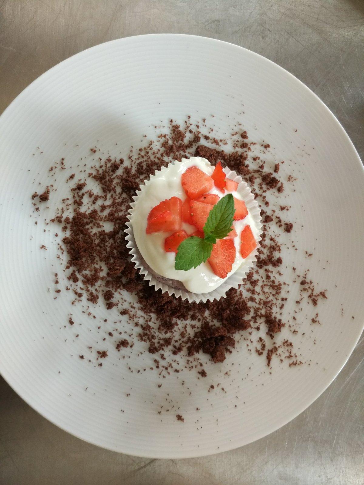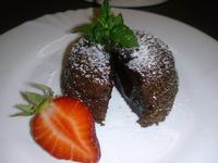 Dezert: čokoládový dort se lžičkou vyšlehané šlehačky a višňovou omáčkou