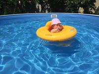 Synovi bude za chvíli 8 měsíců, ale už déle se rád koupe se svým starším bráchou. Do bazénu chodíme v těchto parných dnech skoro každý den. I když celý den kňourá, bazén a voda vždy zabere. Je v ní spokojený.
